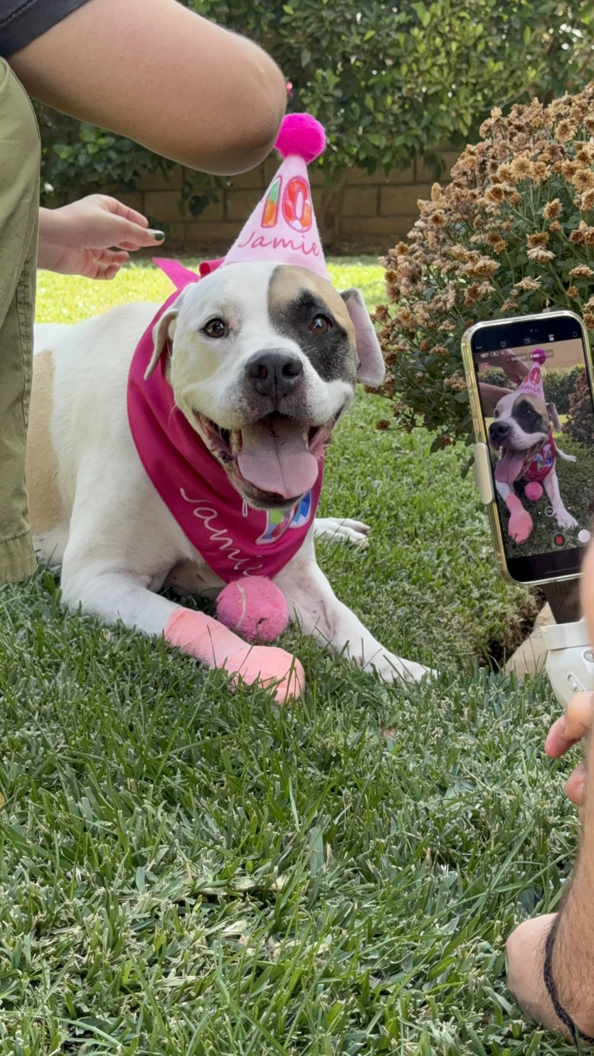 Enter our team 🤝 Party Animal. Together, we drove an hour and a half each way to set up a backyard “party” just for Jamie, creating a beautiful, safe environment for filming. A former adopter [thank you, Shana] generously offered their parents’ yard for us to capture the perfect backdrop.